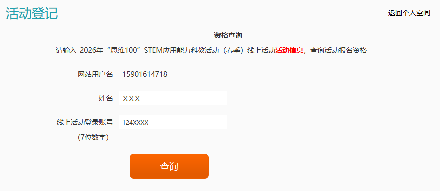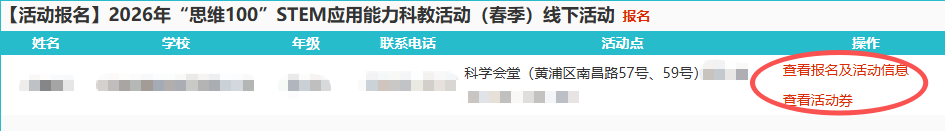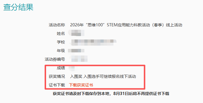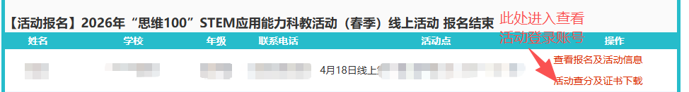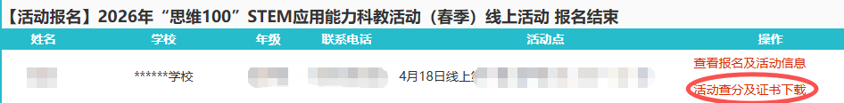 2.在“2026年‘思维100’STEM应用能力科教活动(春季)线上活动”中找到对应的线上活动报名记录,点击右侧“活动查分及证书下载”,即可查询你的活动成绩和入围下阶段活动情况。