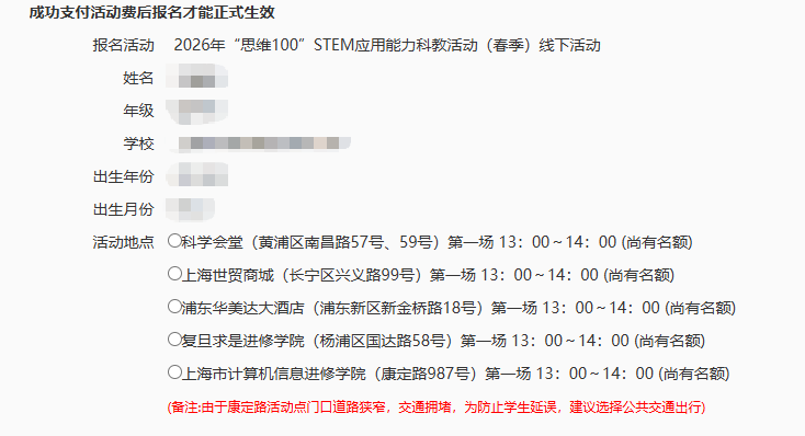 4.选择线下活动点,完善地址信息,完成支付即报名成功。费用300元。注意:各活动点名额有限,报完即止。